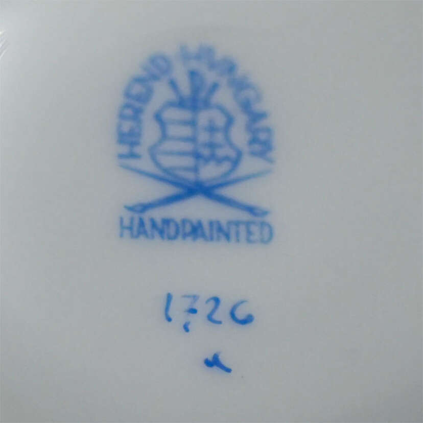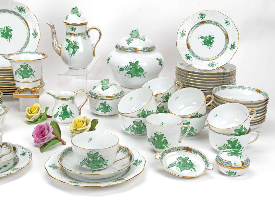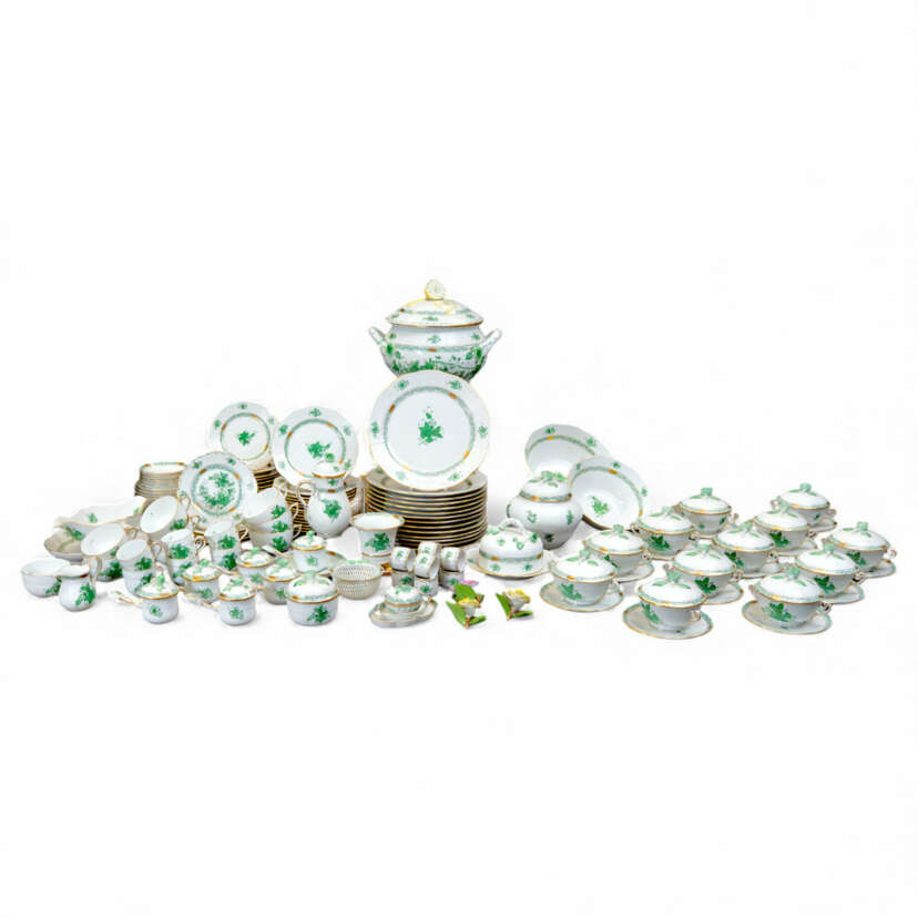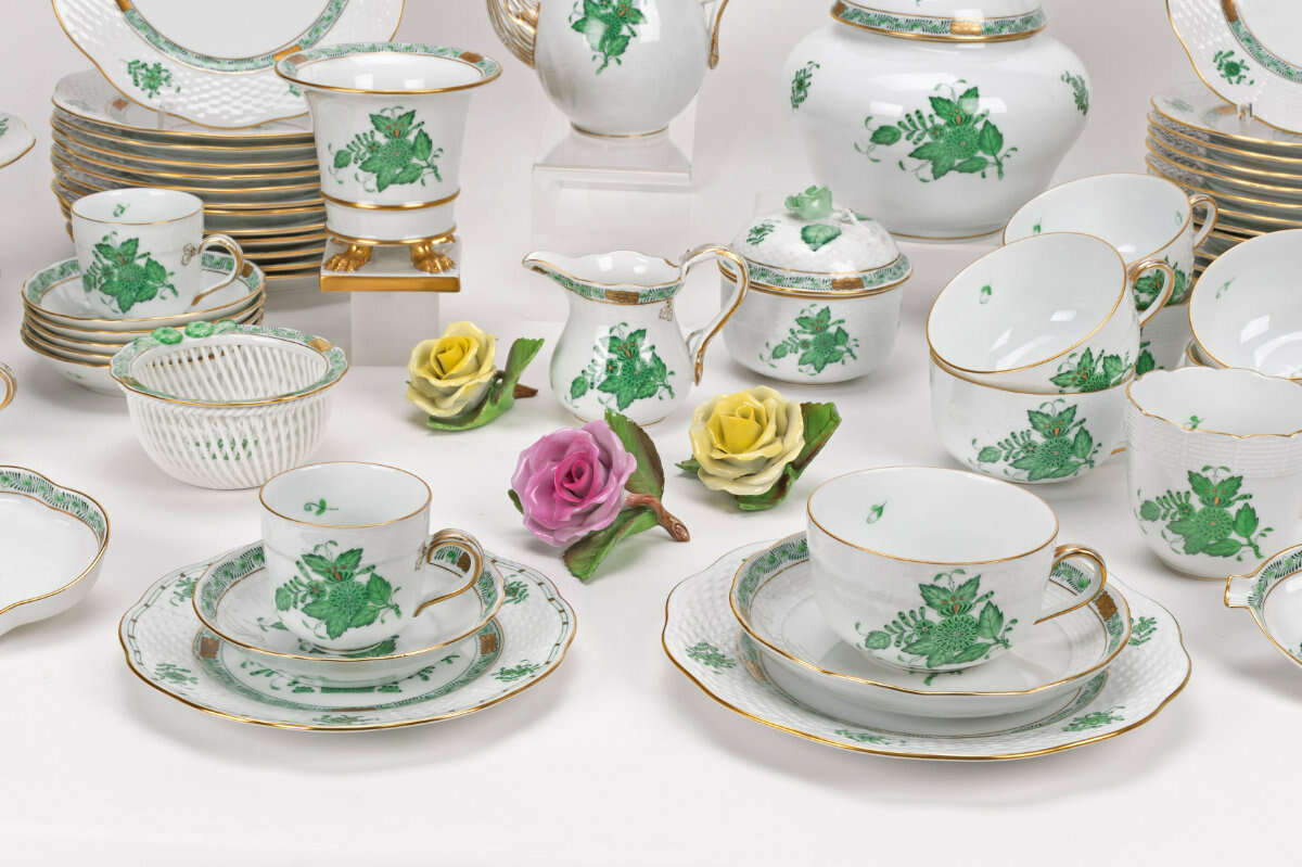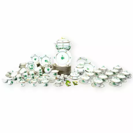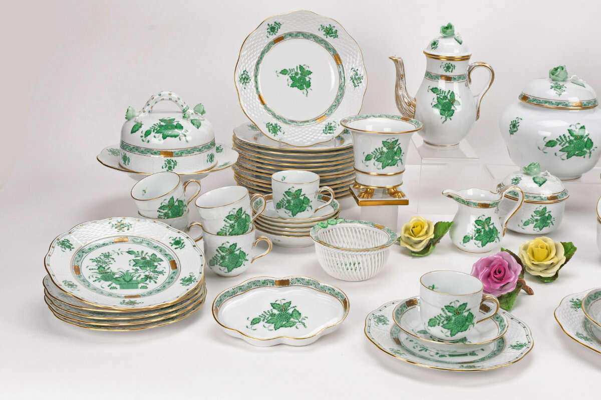 135-tlg., Herend, Ungarn, Porzellan, weiß, grün bemalt und gold staffiert, jeweils 'Apponyi grün', 14 Speiseteller, Ø 26 cm, 14 Vorspeiseteller, Ø 19 cm, 14 Dessertteller, Ø 16,5 cm, 6 Dessertteller 'Fleur des indes grün', Ø16,2 cm, 12 Suppendeckeltassen, 12 Suppenuntertassen, Ø 15,7 cm, 1 Suppenterrine 'Fleur des indes grün', H 23 cm, 1 Sauciere, L 26 cm, 6 Cremetöpfchen, H 8 cm, 1 rundes Deckeldöschen, Ø 6,5 cm, 8 Serviettenringe, Ø 4,2 cm, 2 große Vorlegeschüsseln, Ø 20 und 22 cm, 6 Mokkatassen, 6 Mokkauntertassen, Ø 11 cm, 1 Mokkakanne, H 18 cm, 9 Teetassen, 9 Teeuntertassen, Ø 13, 8 cm, 1 Kaffeetasse, Ø 8 cm, 1 Kaffeeuntertasse, Ø 14,5 cm, 1 Gebäckdeckeldose, H 16 cm, 1 Butterdose, H 12 cm, 1 Zuckerdöschen, H 10 cm, 1 Milchkännchen, H 8 cm, 2 kleine Anrichteplättchen, L 11 und 14 cm, 1 kleine Anrichteschale mit Korbrand, Ø 10 cm, 1 Vase, H 10,5 cm, 3 Tischdekorosen, 5 x 7,5 x 8 cm, alle Teile mit Manufakturmarke, Malermarke und Modellnummer, Zustand A, Tischdekorosen partiell gechippt