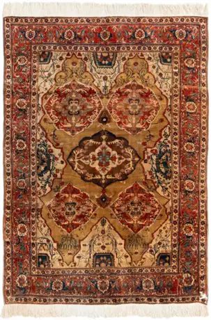 NW-Persien, um 1880. Flormaterial und Kette reine Seide. Dichtes florales Werk mit prachtvoller Musterung. Im seltenen kamelhaarfarbenen Feld, das aus einem mehrfach eingeschnürten Rechteck geformt ist, thront ein stilisiertes braunes Rauten-Medaillon mit 2 Anhängern, begleitet von 4 roten sekundären Medaillons und weissen Halbrauten, die mit floralen, nachtblauen Kartuschen geschmückt sind. Die rote Palmetten-Sägeblatt-Bordüre bildet einen stimmigen farblichen Kontrast zum Innenfeld. In einer Ecke befindet sich ein Loch. Der Teppich ist geschmeidig (nicht brüchig), gute Erhaltung. 140x188 cm (ft. 4.6x6.2).