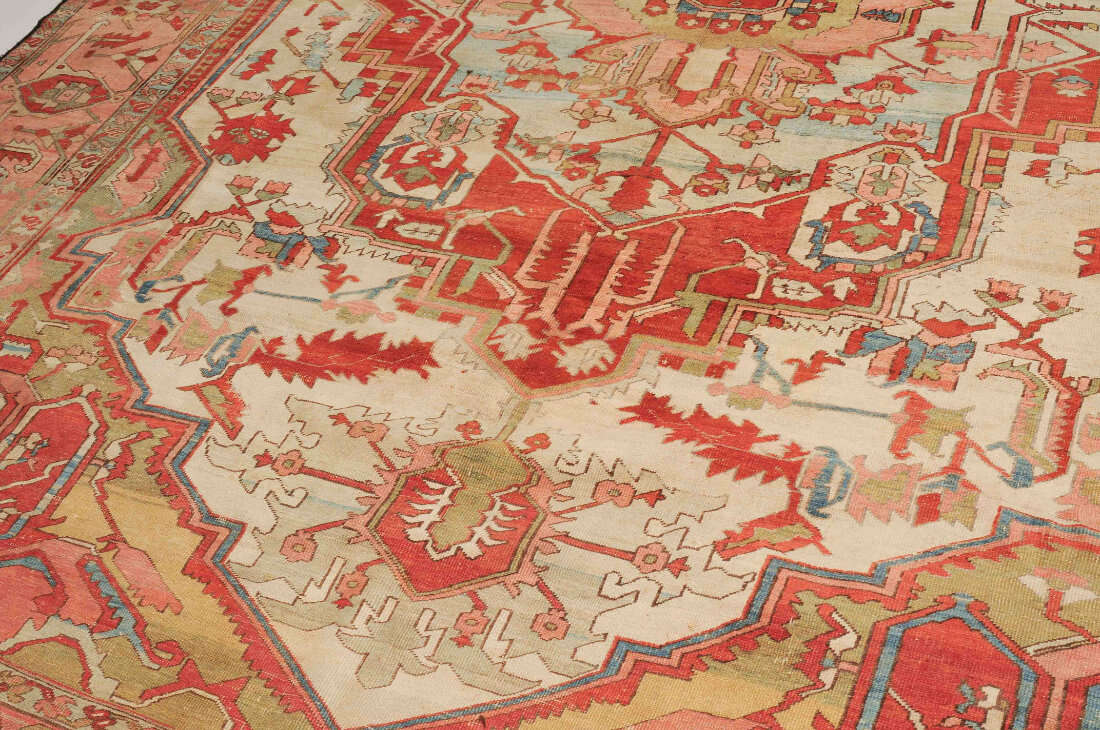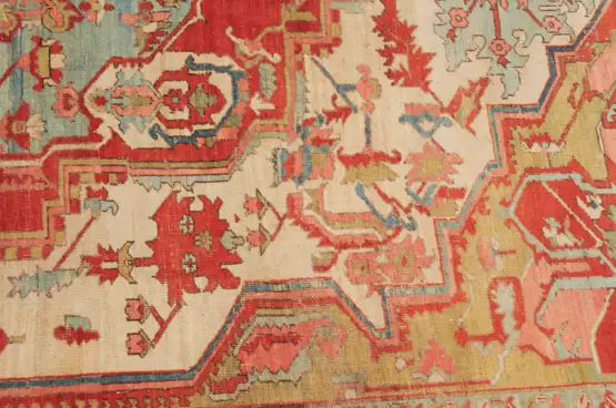 NW-Persien, um 1900. Im weissen Mittelfeld liegt ein prächtiges, in Rot und Hellblau gehaltenes Heriz-Medaillon mit 2 aussergewöhnlichen Palmetten-Anhängern, flankiert von stark geometrischen Blattranken, Blütenmotiven sowie 4 stilvollen Eckzwickeln. 2 Rosettenborten säumen die grosszügig angelegte, rosarote Palmetten- und Blattranken-Hauptbordüre, die einen harmonischen Rahmen bildet. Eine Aussenkante muss befestigt werden, auf beiden Seiten fehlen die Endbordüren. Starke Gebrauchsspuren. 295x390 cm (ft. 9.7x12.9).