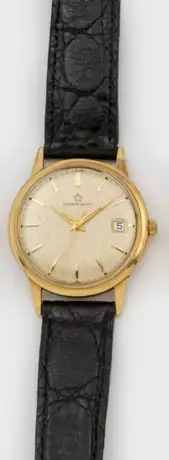 Gelbgold, gest. 14 ct.; Rundes Uhrengehäuse, acrylfarbenes, gekörntes Zifferblatt mit Stabindexen und Lanzenzeiger mit Tritiumauflagen und Datumsanzeige. Automatikwerk. Schwarz geprägtes Lederarmband mit Dornenschließe. Herstellerzeichen. D. 34 mm. Gew. ca. 36,57 g.
