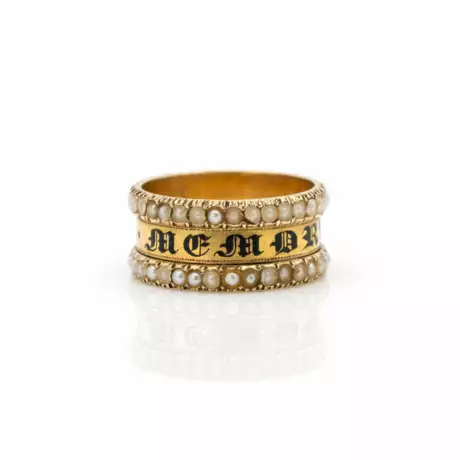England, 19. Jhd., 750 Gelbgold, punziert, Inschrift 'Memory of IN (UN oder TN)', mit Saatperlen besetzt, Ringgröße 53, Gesamtgewicht ca. 4,8 g