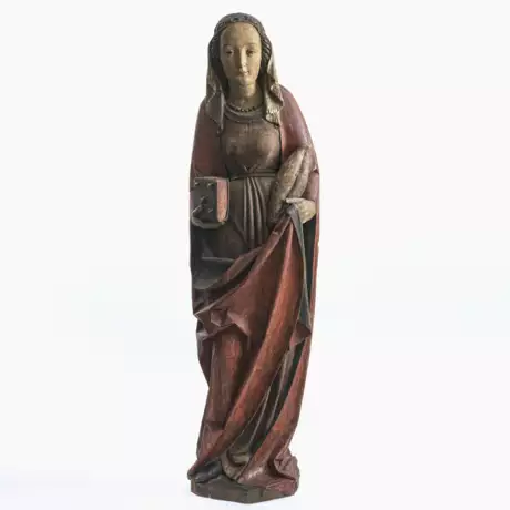 Über polygonaler Plinthe stehend, in den Händen Buch und Brot. Körpernah drapiertes Kleid, der Mantel vor den Körper gezogen und in Schüsselfalten fallend.