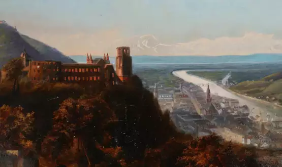 (1859 Kassel - Heidelberg 1933). zugeschrieben. Ansicht auf Schloss und Stadt. Öl und Aquarell auf Papier. schwarz umrandet. Bildgr. 35 x 53 cm. - Dekoratives Blatt. -