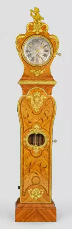 Rosenholz, furniert sowie Einlagen aus unterschiedlichen Edelhölzern und Applikationen aus vergoldeter Bronze. Über gekantetem Profilsockel balusterförmiger, eintüriger Korpus mit profilgerahmtem Pendelfenster. Korrespondierender Uhrenkopf mit plastischer Puttenbekrönung sowie verglastem Zifferblatt mit Datumsanzeige sowie Sekundenanzeige mit einem doppelten 30-Sekunden-Sektor, bez. Thiout L'ainé, Paris. Mechanisches Werk mit Halbstundenschlag auf Glocke. Rest. mit Erg.; H. 208 cm.