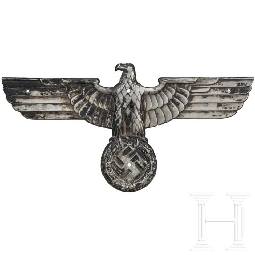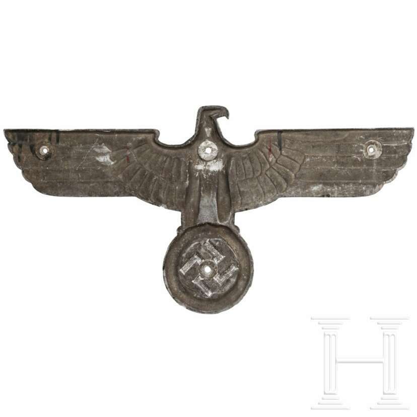 Reliefierter Hoheitsadler aus Leichtmetall mit Resten der kriegsbedingten schwarzen Bemalung. Die rs. Bezeichnung teils entfernt, noch erhalten "LOK RZA 6 BLN". Die vier Gewindestifte entfernt und durchgebohrt. Flügelspannweite ca. 69 cm.