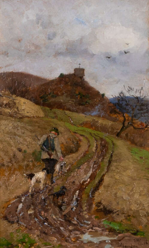 Wanderer, Öl auf festem Karton, 28 x 17 cm Kartonmaß, signiert, '14.1.1911' datiert, partiell berieben, reinigungsbedürftig