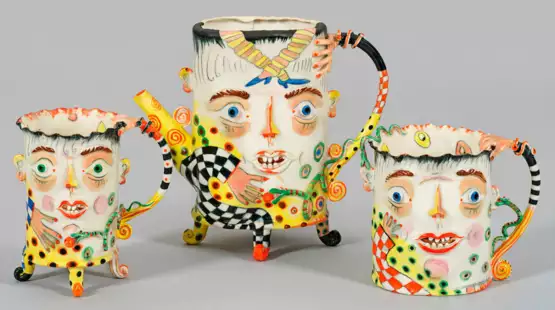 Hochovale Formen, teilw. auf Volutenfüßchen stehend. Seitlicher, als Arm einer an der Wandung haftenden Hand gestalteter Griff. Schauseitig der Wandung reliefplastisch gearbeitete, humorvoll-abstrakt dargestellte Gesichter, von farbenfroher Ornamentik begleitet. Entw. Irina Zaytceva. Künstler-Monogr. "I. Z." Polychrome Malerei. H. 11,5 cm - 19,5 cm.