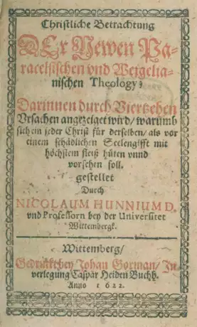 I) VD17 39:151194Z. Vgl. Sudhoff 306, Anm. Erste deutsche Ausgabe. - Sehr seltene, erstmals 1619 in lat. Sprache erschienene Gegenschrift auf die "Philosophia mystica" des Paracelsus von 1618, die auch Texte Valentin Weigels enthielt. - Hunnius war Professor an der theologischen Fakultät der Universität Wittenberg. - II. VD17 23:644334S. DG 10.4053. Zweite Ausgabe (erstmals im Vorjahr erschienen). - Balduin ist vermutlich lediglich Übersetzer der lat. Ausgabe. - Leicht gebräunt, 1. Titel verso mit altem hs. Besitzvermerk u. gestempelt, die letzten Bll. mit kl. Wurmgängen, Ebd. leicht fleckig.