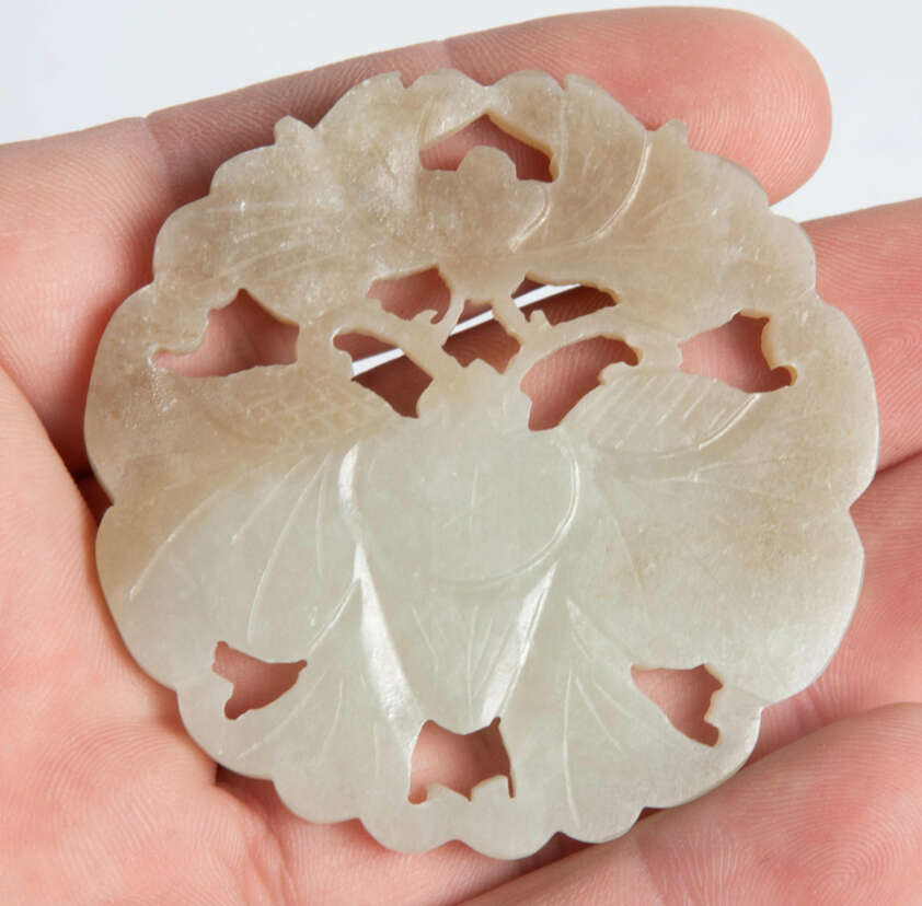China, 20.Jh. Hell celadonfarbene und karamellbraune Jade. Zwei durchbrochen gearbeitete Schmetterlinge. D 5,7 cm.