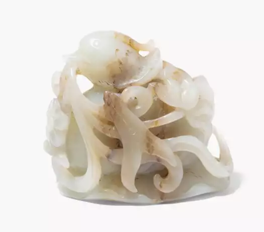 China, 20.Jh. Celadongrüne Jade. Ente, die eine Lotusblüte im Schnabel hält. H 4,5 cm.