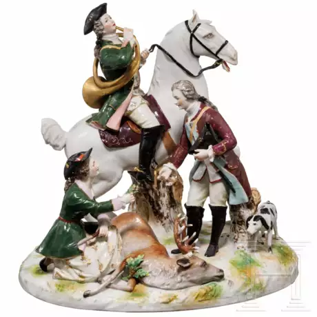 Porzellan, farbig staffiert. Ovaler Erdsockel mit Baumstumpf und Blattbelag. Reiter auf sich aufbäumendem Pferd, das Jagdhorn blasend. Im Vordergrund Kavalier mit Hund vor einer hockenden Dame mit Fächer. Zwischen ihren Füßen liegt der erlegte Hirsch.