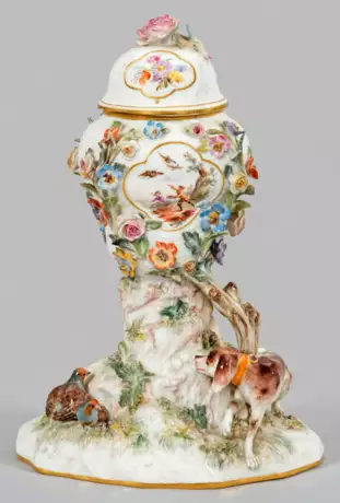 Felsiger, mit Blättern und Blüten belegter, aufsteigender Sockel mit sitzenden Fasanenhennen und sich anschleichendem Jagdhund als Träger für eine balusterförmige Vase. Passig aufgewölbter Deckel mit plastischem Rosenknauf. Oberhalb der Wandung goldkonturierte Vierpasskartusche mit Jagdszene, rücks. Blumengebinde. Beidseitig der Wandung von emporwachsenden, feinmodellierten Blütenranken umzogene Blütengebinde und Einzelblüten in polychromer Malerei mit Goldstaffage. Entw. Johann Gottlieb Ehder. Modell-Nr. 864. Teilw. best/rest.; Schwertermarke. H. 22 cm.