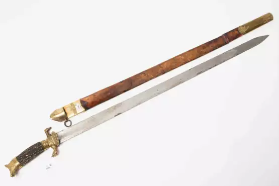Deutschland, 1. Hälfte 19. Jh. Vergoldetes Messinggefäss mit Knaufkappe in Form eines Eberkopfes. Parierstangenenden als Hundeköpfe gestaltet, muschelförmiges Terzstichblatt, Griffzwinge mit Eichenlaub verziert. Hilze aus unbeschliffenem Hirschhorn. Beidseitig breit gekehlte, nur leicht fleckige Rückenklinge (L 84,5 cm) mit Mittelspitze und 20 cm langer Rückenschneide. Zugehörige, allerdings geschrumpfte Lederscheide mit reparierter Bruchstelle. Die Klinge kann nicht mehr eingesteckt werden. Ortband und Mundblech aus vergoldetem Messing. Letzteres mit Tragring und Besteckfach, Inhalt fehlt. L 102 cm.