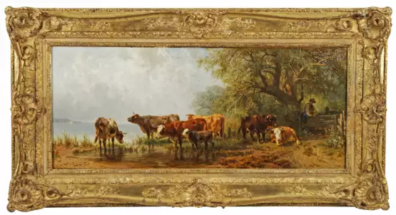 Mit großem Detailrealismus lebensnah wiedergegebene Gruppe von Rindern bei der Tränke an einem Seeufer. Meisterhaft bringt der Münchner Künstler Friedrich Voltz die verschiedenen Farbschattierungen des Tierfells und das lebendige Licht- und Schattenspiel, das das Sonnenlicht trotz des bedeckten Himmels hervorruft, zur Anschauung. Nach seinem Studium an der Münchener Kunstakademie (1834/35), wurde das Jahr 1841 zum Wendepunkt für Voltz, als er in Holland erstmals das Bild „Der junge Stier“ aus dem 17. Jh. von Paulus Potter sah und er sich danach vorrangig der Tiermalerei widmete. Seine Landschaften mit Tieren malte er, wie im vorliegenden Bild, gern auf überbreite Bildformate, die man auch als Münchner Handtuchformat bezeichnet. Ab etwa 1850 beschäftigte er sich mit der lebensnahen Darstellung der Tiere und der ländlichen Bevölkerung seiner bayerischen Heimat. Beeinflusst wurde er außer durch Potter, Christian Morgenstern und Albrecht Adam, insbesondere durch seine Münchener Künstlerfreunde Carl Spitzweg und Eduard Schleich d. Ä.; Öl/Holz; R. u. sign., dat. (18)70 u. bez. „München“. 38,5 cm x 90 cm. Rahmen. Beiliegend Expertise von Horst G. Ludwig vom 25.5.2020.