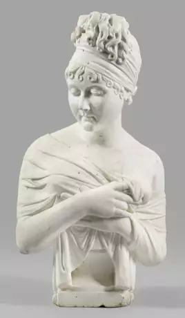 Weißer Marmor. Subtil ausgeführte Darstellung, nach der berühmten 1804-1808 entstandenen klassizistischen Büste, die sich seit 1909 im Musée des Beaux-Arts in Lyon befindet. Diese ist sowohl eine der bekanntesten Porträtbüsten der Dargestellten als auch eins der bedeutendsten Werke des Bildhauers. Chinard schuf 1795/96 - 1812 mehrere Büsten von Juliette Récamier in unterschiedlichen Materialien. Die Büste in Lyon entstand zu der Zeit, als Chinard ab 1805 einige Zeit im Haus von Juliette Récamier lebte und als jene eine Liaison mit Prinz August von Preußen hatte. Plinthenkante ger. best.; H. 61 cm.