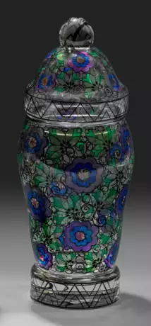 Farbloses Glas, Dekor in polychromer floraler Emailmalerei, mit Blättern und schwarzem Rankenwerk. Ges.-H. 20,5 cm.