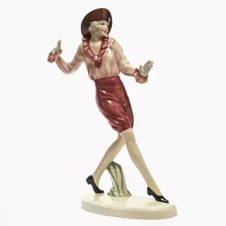 Steingut, farbig glasiert. Mit knielanger roter Hose. Auf ovalem Sockel geprägt: Lorenzl. Firmenmarke, Made in Austria, hand-decorated. Mod. Nr. 5902, 20, 11. Schwarze Maler-Nr. H. 36 cm.