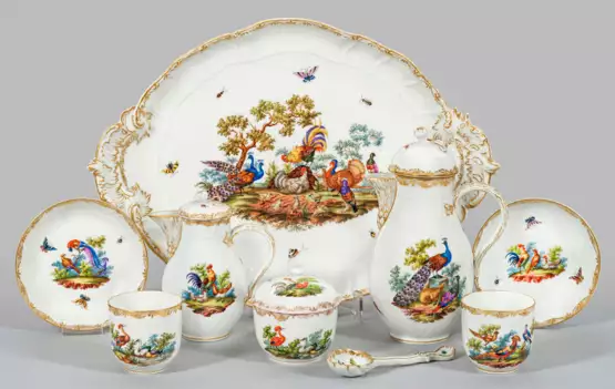7-tlg.; Kaffeekanne, Milchkanne, Zuckerdose, zwei Kaffeetassen mit Untertassen, Löffel, großes Tablett. Reliefdekor "Neuosier". Birnförmige Körper mit Asthenkel bzw. ovale, passig geschweifte Form mit blattreliefierten Handhaben. Deckelbekrönung mit plastischer Blüte. Beidseitig der Wandung und im Spiegel szenische Darstellungen von Federvieh und Vögeln- mit Pfauen, Truthahn, Hahn und Hennen sowie Küken in baumbestandener Hoflandschaft. Verstreut fliegende Schmetterlinge, Insekten und eine Schnecke. Feine polychrome Malerei außerhalb der Manufaktur. Goldstaffage. Partiell minim. rest./best.; Löffel ungemarkt. Zeptermarke. Tablett 43 cm x 31 cm. Kannen-H. 16 cm - 22,5 cm.