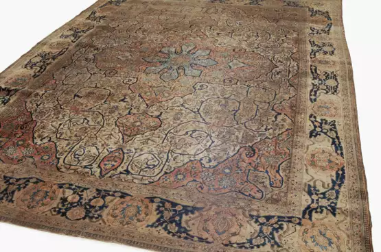 Z-Persien, um 1900. Im beigen Mittelfeld figuriert ein eindrucksvolles rotes Kreuzmedaillon mit einer hellblauen Blüte im Zentrum und 2 Anhängern, flankiert von filigran gezeichneten Blütenmotiven, Rankenkompositionen, nachtblauen Arabesken und 4 gewellten Eckzwickeln. Die nachtblaue, mit prächtigen Palmetten verzierte Hauptbordüre bildet einen schönen Kontrast und harmoniert mit dem Feld. Fleckig, Risse und starke Gebrauchsspuren. 252x356 cm (ft. 8.3x11.7).