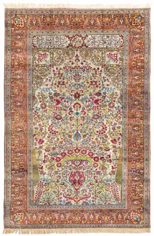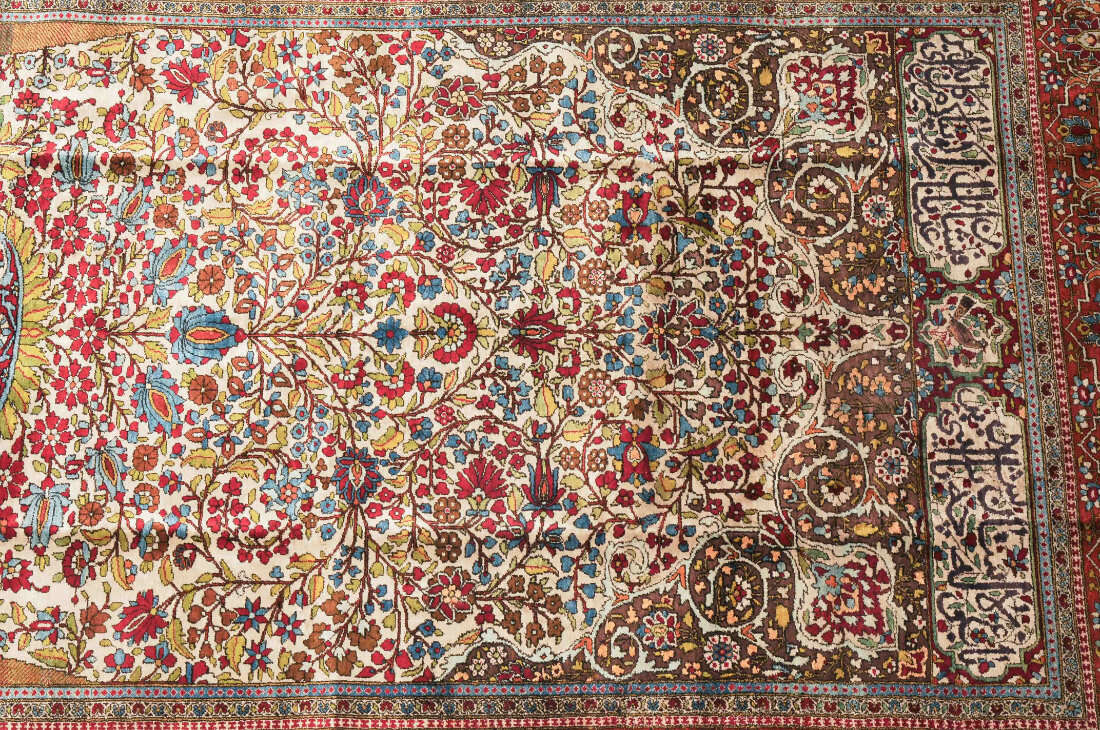 Z-Persien, um 1900. Flormaterial reine Seide. 2 Kartuschen mit persischen Gedichten liegen über dem floralen Giebel, unter dem sich auf beigem Grund das Feld erstreckt, in dem eine kunstvoll gezeichnete, blumengefüllte Vase figuriert, seitlich flankiert von fein gearbeiteten Bäumen und einem dicht platzierten, floralen Dekor mit Blütenmotiven in verschiedenen Variationen und stilvollen Blattranken. Die leuchtend rote Hauptbordüre ist mit Palmetten und Ranken stimmig besetzt. Gute Erhaltung. 125x195 cm (ft. 4.1x6.4).