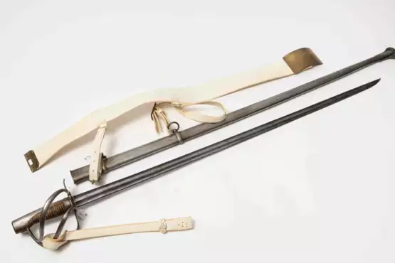 Frankreich, um 1820. Eisernes Bügelgefäss mit lang ausgezogener Knaufkappe, Griffbügel, zwei Terzspangen und Stichblatt. Gerillte, lederbezogene Hilze. Stichblatt auf der Unterseite gestempelt mit "4710", "120", "2.4.". Gerade, beidseitig je zweifach gekehlte Rückenklinge (L 94,5 cm) mit Rückenspitze und terzseitigen Abnahmestempeln "B", "D" und "L", Klingenthal?. Stahlscheide mit zwei Ringbändern und Schlepper. Mit rezent ergänztem Schlagband und Gehänge aus weiss gegerbtem Leder mit Messingbeschlägen und Schnallen. L 109 cm.