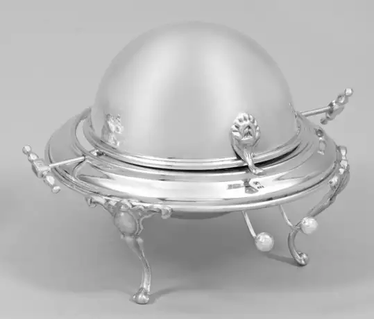 Sterlingsilber. Halbrunder Korpus auf drei hohen, gebogten Beinen, am Ansatz mit Voluten und Kartuschen verziert. Glatter Klappdeckel mit seitlichen, drehbaren Griffen. Frontseitige Löffelablage. Glaseinsatz. Gest. 925. Gew. ohne Glaseinsatz ca. 595 g. H. 13,5 cm.