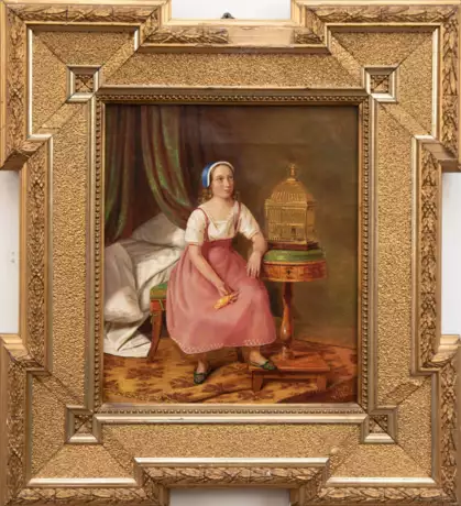 Los 155 | Kiesewetter, Wilhelm August (1811 Berlin-1865 Gotha) "Biedermeierinterieur mit Mädchen und Vogelbauer", Öl/ Lw., sign. u.r., 26,5x23 cm, Prunkrahmen (Er war ein deutscher Maler und Ethnograph. Kiesewetter unter…