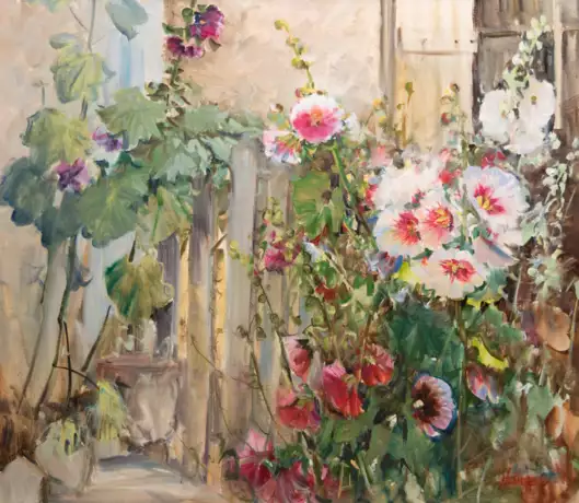 Los 23 | Klaes, Wienand-Pseudonym Hansen (1940) "Stockrosen", Öl/ Lw., sign. u.r., mit Originalbrief, 90x100 cm, Rahmen