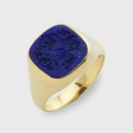 Ring set with a coat of arms engraved lapislazuli, in 14 k gold.