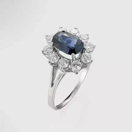Weißgold, 18 k. Zentral besetzt mit einem Saphir von ca. 1,00 ct. im Ovalschliff, entouriert von Brillanten von zus. ca. 0,70 ct. (H/si). Gew. ca. 3,68 g.