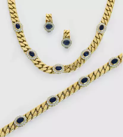 Collier, korrespondierendes Paar Ohrclips und Armband. Gelbgold gest. 585/750. Collier schauseitig besetzt mit Saphircabochons von zus. ca. 8,63 ct., entouriert von Brillanten von zus. 0,93 ct. (H/si). Armband mit Saphir-Cabochons von zus. ca. 7,18 ct., entouriert von Brillanten von zus. ca. 0,88 ct. (H/si) sowie Ohrclips mit Saphir-Cabochons von zus. ca. 2,50 ct., entouriert von Brillanten von zus. ca. 1,60 ct. (wesselton/si). Ges.-Gew. ca. 168,15 g. Sehr schöne Goldschmiedeausführung.