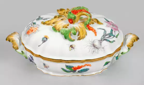 Oval gedrückte, durch Grate gegliederte Form mit seitlichen, vegetabilen Griffen. Passig aufgewölbter Deckel mit der Bekrönung in Gestalt einer plastisch gearbeiteten Pfefferschote. Umlaufend der Wandung und auf dem Deckel sog. "trockene Blumenmalerei mit Früchten" in Anlehnung an die Holzschnittblumen. Feine poylchrome Malerei mit Goldstaffage. Entw. nach Johann Joachim Kaendler. Aus der limitierten Serie "SinnBilder". Limitierung 04/50. Zertifikat. Schwertermarke mit Goldsignet. L. 19,5 cm. H. 10,5 cm.