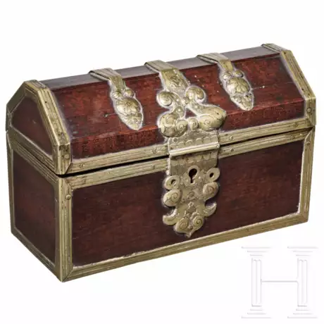 Rechteckiges Kästchen mit gewölbtem Deckel aus Palisanderholz(?). Beschläge aus getriebenem und graviertem Messing. Vorderseitiges Schlüsselblech, der Schlüssel fehlt. Im Deckel der originale Innenfachdeckel aus fein graviertem Zinn, der Verschlusshebel fehlt. Die ursprüngliche Inneneinrichtung verloren. Eine Messingleiste an der linken Seite des Deckels fehlt. Maße 10 x 15,5 x 7,5 cm.