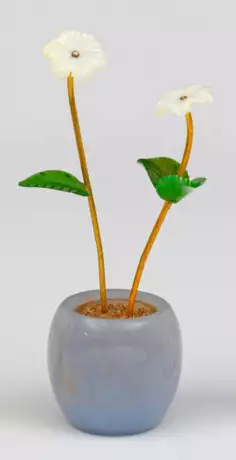 in der Art von Karl Fabergé. Achat und Silber, vergoldet. Konischer Topf aus hellblauem Achat mit zwei einsetzbaren, schmalen Blütenstängeln, bekrönt von einer Blüte aus weißen, geschliffenen Steinen. Gest. 88. H. 12,5 cm.