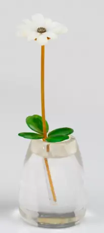 in der Art von Karl Fabergé. Farbloses Glas und Silber, vergoldet. Konischer Topf mit einsetzbarem, schmalem Blütenstängel, bekrönt von einer Blüte aus weißen, geschliffenen Steinen. Gest. 88. H. 13 cm.