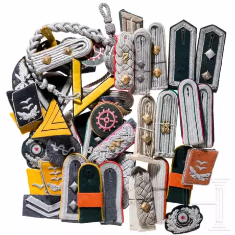 14 Paar Schulterklappen und Kragenspiegel in verschiedenen Waffenfarben von Heer, Luftwaffe und Küstenartillerie, dazu Einzelstücke, Tätigkeitsabzeichen, Rangwinkel sowie eine Schützenschnur und ein Ausgehkoppelschloss des Heeres. Teils beschädigt, mottig.