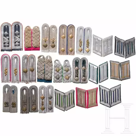 Schulterstücke/-klappen und Kragenspiegel in unterschiedlichen Waffenfarben, u.a. in dem Blau der Sanitätstruppe bzw. des Truppensonderdienstes, dem Karmesinrot der Veterinärtruppen oder dem Wiesengrün der Panzergrenadiere u.a. teils ziviler Einheiten. Dazu Schulterstücke und Kragenspiegel für einen Oberleutnant der Küstenartillerie sowie einen Oberfeldwebel an der Luftnachrichtenschule. Teils mottig oder mit Lagerungsschäden.