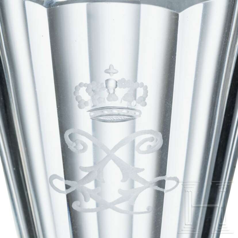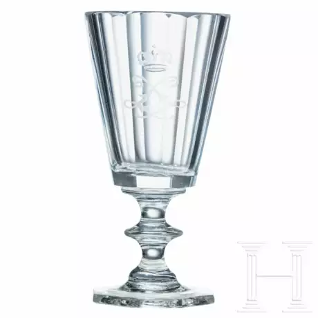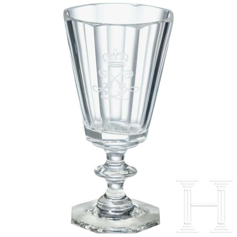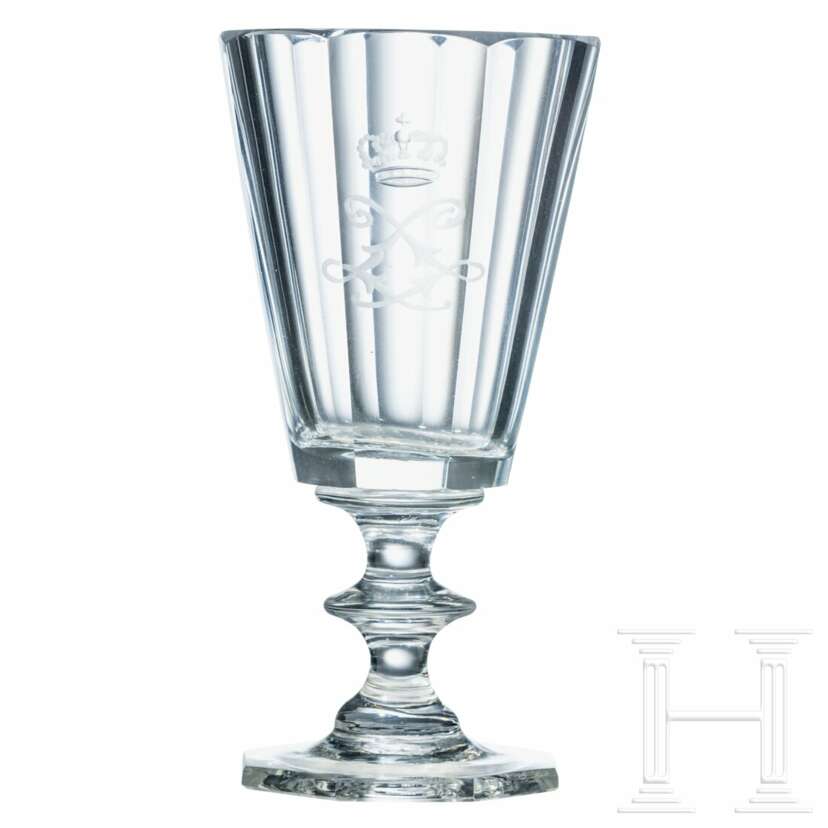 Konische, facettierte Kuppa, schauseitig die bekrönte Spiegelchiffre "L" in Mattschliff, Schaft mit gedrücktem Nodus, achteckiger Fuß. Höhe 12,3 cm. Vgl. Auktion 31, Los 2402, sowie identisch gearbeitete Gläser aus Herrenchiemsee (König-Ludwig II.-Museum Herrenchiemsee, Inv.-Nr. 3203 - 3209).