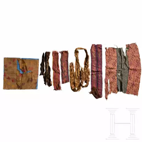Bunte Gewebeelemente, partiell mit Vögeln und geometrischem Dekor. Fehlstellen. Verschiedene Größen. Ein Stück auf Papier befestigt, Maße 35 x 37,5 cm. Maße großes Gewebe 39 x 57 cm. Falls nicht in der Beschreibung anders erwähnt, erfolgt die Altersbestimmung aufgrund der Charakteristika des Objekts, ohne ein weiteres Gutachten.