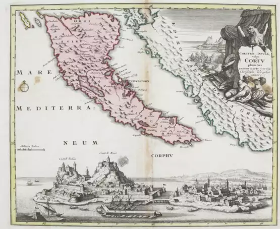Corcyrae insulae vulgo Corfu. Kolor. Kupferstichkarte bei C.Weigel, um 1720. 30,5 x 36 cm. Mit fig. Titelkart. u. gr. Gesamtansicht der Stadt. - Falz leimschattig, vereinz. braunfl.