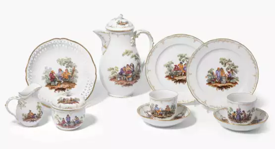 2.Hälfte 20.Jh. Porzellan. Im Spiegel Genreszenen in feiner polychromer Malerei. Fahne mit Reliefdekor, goldfarben staffiert. Bestand: 1 Kaffeekanne, 1 Crémier, 1 Zuckerdose, 6 Kaffeetassen mit Untertassen (H 7 cm), 6 Dessertteller (D 19,5 cm), 1 runde Schale mit Durchbruchdekor. Total 16 Teile.