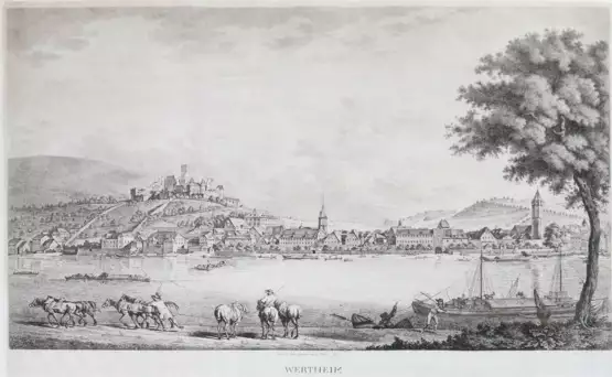 Schefold 35235. - Seltene Ansicht. Blick vom re. Mainufer, re. hinter dem Randbaum die Mündung der Tauber, am Ufer re. Frachtschiff, li. dessen Treidelpferde bzw. Leinreiter. - Seitl. bis Einfassung beschn.