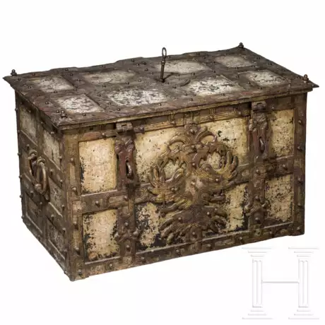 Rechteckiger Korpus aus Eisenblech, die vernieteten Verstärkungsbänder mit floral getriebenem Dekor. Schauseitig getriebener Zierbeschlag in Form eines doppelköpfigen Adlers. Seitlich zwei bewegliche Tragegriffe. Scharniergelagerter Deckel mit zentralem Schlüsselloch, Schlüssellochabdeckung fehlt. Vorderseitig zwei Fallriegel für Hangschlösser. Mechanik mit acht Zuhaltungen, unvollständig, nur vier Riegel aktiv. Funktionsfähig mit Volldornschlüssel. Durchbrochen gearbeitete Deckplatte mit Rankendekor. Alte Farbfassung in Weiß und Goldbronze. Maße 52 x 83 x 52 cm. Achtung: Selbstabholung oder bitte vor der Auktion ein Versandangebot einholen!