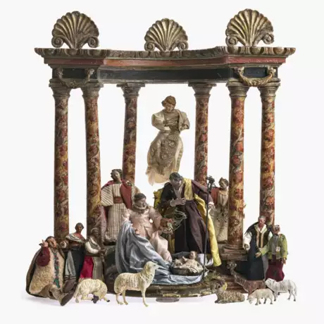 Tempelförmige Krippenarchitektur. Krippenfiguren: hl. Familie auf Sockel, 23 Figuren u.a. hl. Drei Könige, Hirten, Marktleute, 7 Tiere, 5 Finimenti.