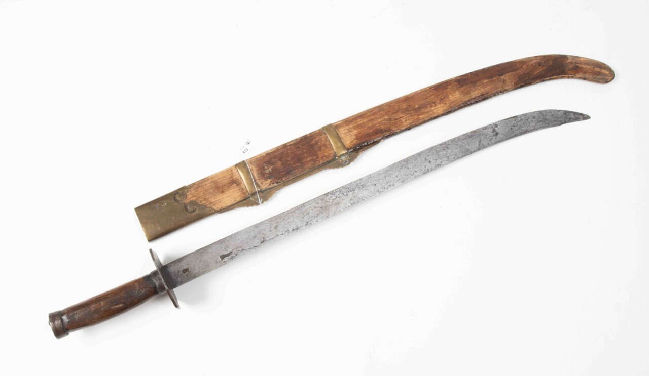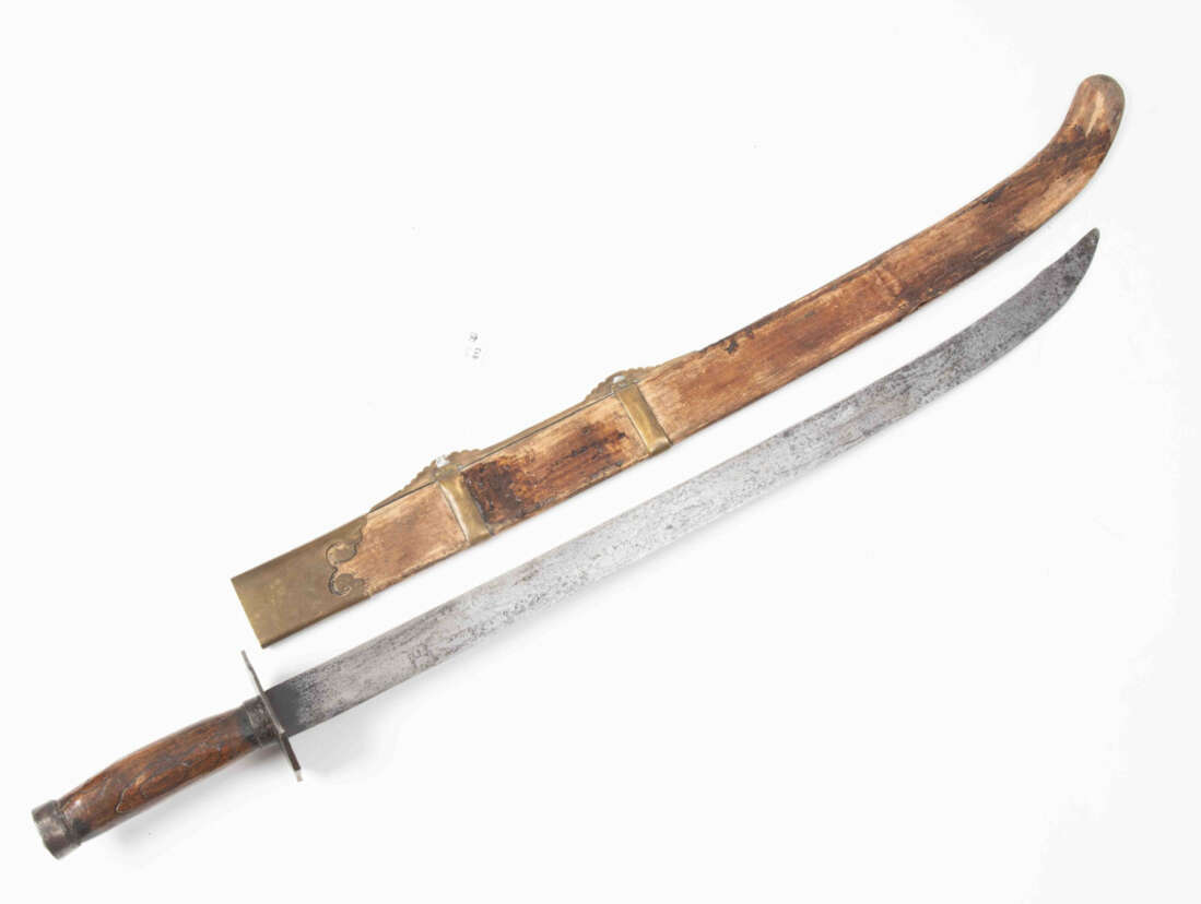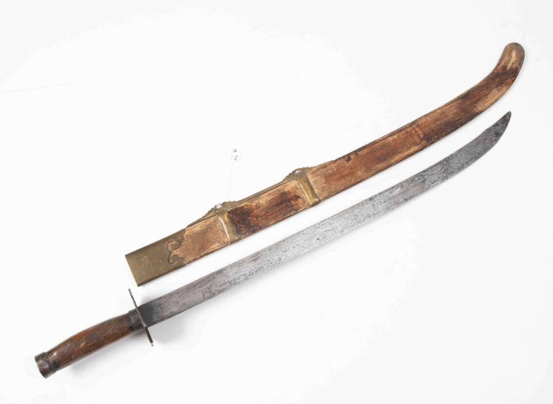 China, 17./18. Jh. Schmuckloses Eisengefäss mit Knaufkappe, Griffzwinge und achteckigem Stichblatt. Fast gerade, volle Rückenklinge (L 70,3 cm) mit angedeuteter Pandurenspitze und Verarbeitungsspuren. Einfache Holzscheide um 1900 mit blanken Messingbeschlägen. L 87 cm.