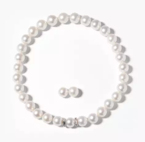750 Weissgold. Runde Südsee-Kulturperlen, 11-14 mm, mit Baguetten und Brillanten. L41 cm, 9 g. Mit zwei Zusatzperlen.