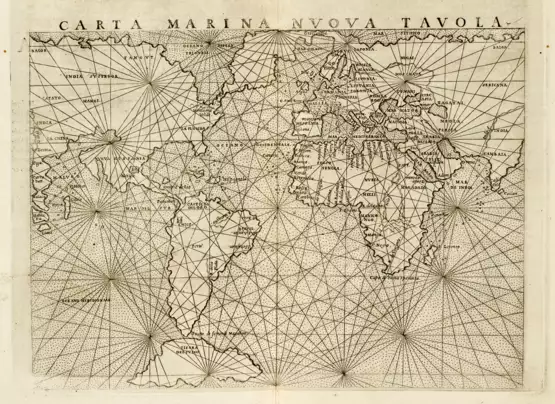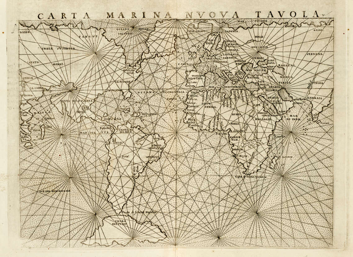 First edition of Ruscelli's translation of Ptolemy. The Renaissance rediscovery of the Greek text of Ptolemy’s Geography captured the imagination of thinkers across disciplines. Although none of the original maps survived antiquity, Renaissance cartographers rose to the challenge of re-illustrating the famous treatise. Here the maps are mostly enlarged versions of those by Giacomo Gastaldi, originally from the 1548 Italian edition printed by Bascarini (see preceding lot). Some maps have been corrected and four maps have been added—including the new map of Brazil. The world maps include an early depiction of the world in twin hemispheres (Shirley 110) a navigational chart (Shirley 111). The translator, Girolamo Ruscelli, was the founder the first European scientific society: the Accademia Segreta in Naples. Adams P-2235; Phillips, Atlases 371; Sabin 66503.
