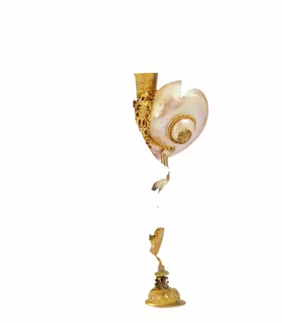 shell with his right hand and head. The nautilus shell is framed with finely crafted