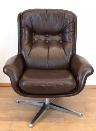 Ledersessel, DDR, kippbar, auf Aluminium-Drehfuß, loses Sitzkissen, Gebrauchspuren an den Armlehnen und im Rückenteil, 98x82x77 cm