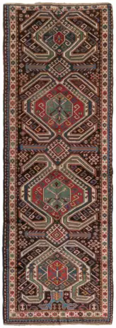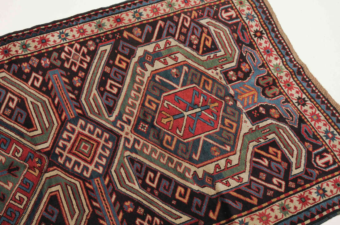 SO-Kaukasus, um 1900. Im nachtblauen Mittelfeld thronen 4 prachtvolle weisse Lenkoran-Medaillons sowie 3 hakenbesetzte Rauten als sekundäre Medaillons, die im Zentrum je mit hakenbesetzten Hexagonen in Rot und Grün verziert sind, flankiert von einzeln gestreuten Blüten in verschiedenen Variationen. Die schmale weisse Sternblüten-Hauptbordüre bildet einen stimmigen Rahmen zum Innenfeld. Kleine, alte reparierte Stelle in der Bordüre, fleckig, Gebrauchsspuren. 126x380 cm (ft. 4.2x12.5).